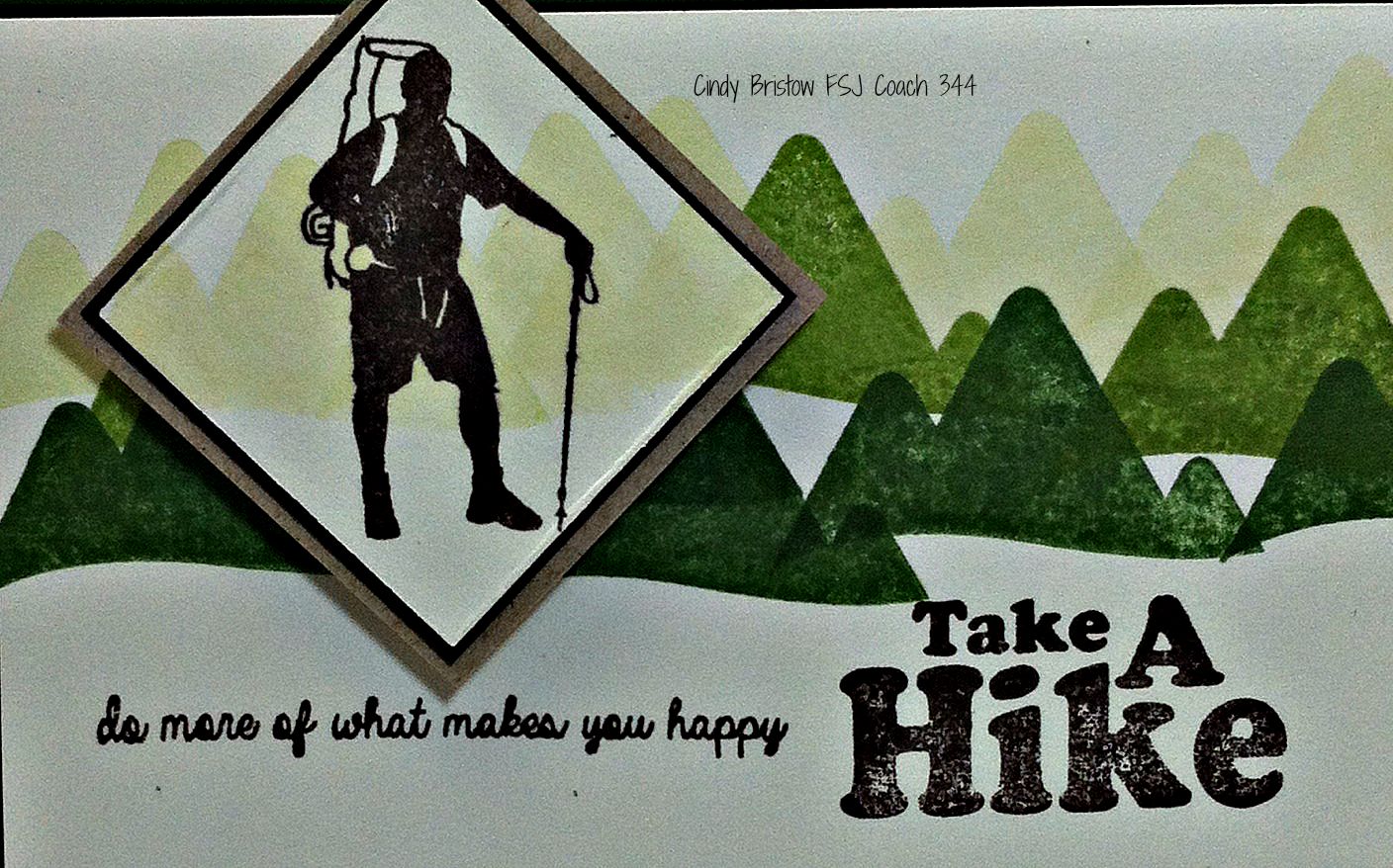 I shadowed stamped the mountains in 3 different colors- Sweet Pear, Lemon Grass, and Kiwi Slice. I love the 3-D look it gives to the card. I also used a sentiment from the Text Happy stamp set, https://shop.funstampersjourney.com/MemberToolsDotNet/ShoppingCartv3/ProductDetail.aspx?CatalogueID=212&ProductID=19360&PartyID=0&PartyGuestID=0&ReferringDealerID=344 . I am in love with this sentiment set. It has so many cool sayings- something for everything!